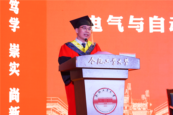 党委副书记、纪委书记陆林代表学校向圆满完成学业并顺利获得学位的各位同学表示热烈的祝贺,向辛勤培育大家的老师、父母、亲友表示衷心的感谢。他希望广大同学要心怀“国之大者”,秉持一代代工大人“工业报国”之精神,为服务国家富强、民族复兴、人民幸福贡献出自己的力量;要锤炼高尚品格,从百年党史中汲取道德力量,从英雄人物身上体悟道德风范,从工大历届杰出员工事迹中感受“追求卓越、勇攀高峰”的道德追求,立大志、明大德;要勇于创新实干,把握时代潮流和国家需要,将仰望星空与脚踏实地完美地结合起来,将工大人求真质朴的风格传承下去,在攀登知识高峰中追求卓越,在肩负时代重任时行胜于言。
