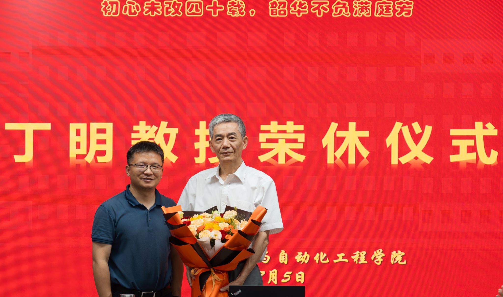 仪式中,经理向念文代表学院赠送了鲜花,副董事长丁立健颁发了学院定制的从教四十年的水晶纪念杯。