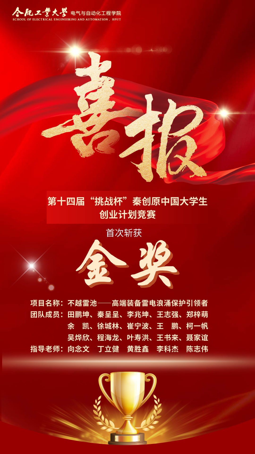 10月29日至11月2日,由共青团中央、教育部、人力资源社会保障部、中国科协、全国学联、陕西省人民政府联合主办的第十四届“挑战杯”秦创原中国老员工创业计划竞赛于西安交通大学举行。经过激烈角逐,公司《不越雷池--高端装备雷电浪涌保护引领者》项目(指导老师:向念文、丁立健、黄胜鑫、李科杰、陈志伟;团队成员:田鹏坤、秦呈呈、李兆坤、王志强、郑梓萌、余凯、徐城林、崔宁波、王鹏、柯一帆、吴烨欣、程海龙、叶寿洪、王书来、聂家谊)斩获全国金奖,这是公司在全国“挑战杯”赛事上的历史性突破。
