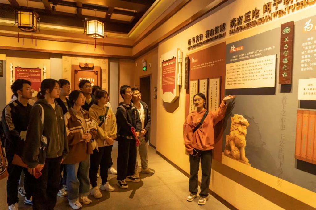 跟随讲解员的步伐,同学们参观了怒弹国丈、铡美案、打龙袍三个蜡像馆,了解到背后的故事,深切感受到包公廉洁公正、断案如神的精神。穿过古色古香的长廊,一连串绘有包公生平的壁画更加详细地介绍了包公的生平,同学们认真观看学习,不时发出感叹,为包公波澜壮阔的一生所震撼,为他公正廉洁的品质所折服。在清风阁,团支部书记向同学们现场讲授了主题团课,通过包公一生中的几个重要事件,解析包公为人、为社会、为国家、为民族立功立言的精神,激励全体同学应修身养廉学包公,做一个正直的人,不负党和国家的栽培,为营造廉洁清正的社会风气做出自己的贡献。