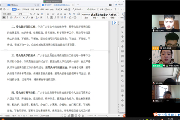 支部负责老师传达公司党委要求,支部全体成员在疫情防控工作中要做到以下三点要求。一是坚定信心,不恐慌,做疫情防控的“践行者”。带头落实学校有关疫情防控工作要求,协助班主任、辅导员以及学校各部门开展网络疫情摸排、自我健康监测与管理等工作,科学理性地应对此次疫情。二是以身作则,强防范,做疫情防控的“宣传者”。自觉按照科学方法做好个人防护,自觉向家人科普防疫知识。发挥青年人对新媒体运用熟练的自身优势,快速筛选信息、甄别信息,主动解读疫情防控相关政策和措施。理性发声,助力营造正能量的网络舆论环境。三是科学规划,充好电,做防控时期的“好学者”。发挥主动性,制定科学、合理的假期学习计划,通过网络、新媒体等线上学习手段,自主学习,确保“停课不停学”。
