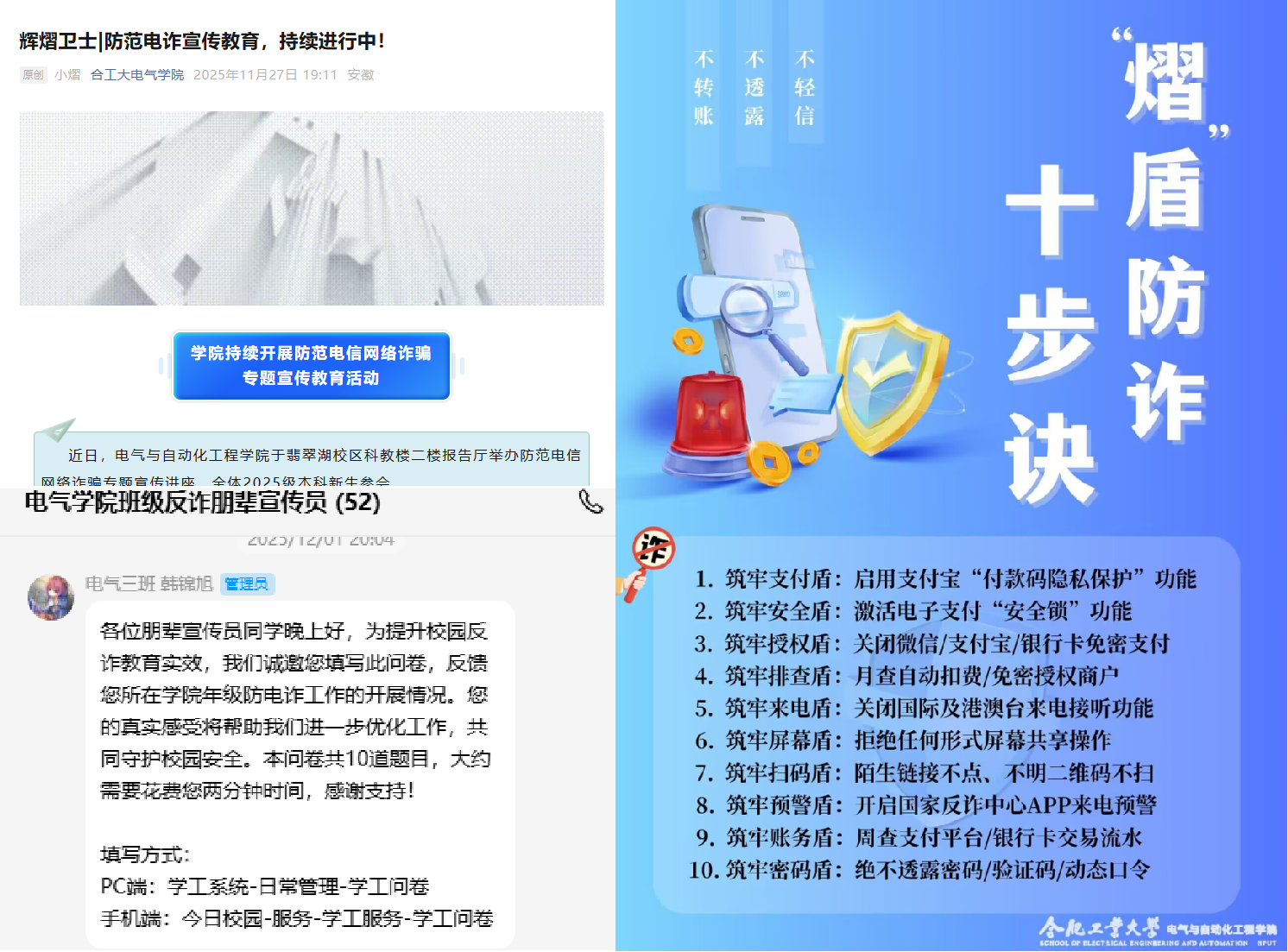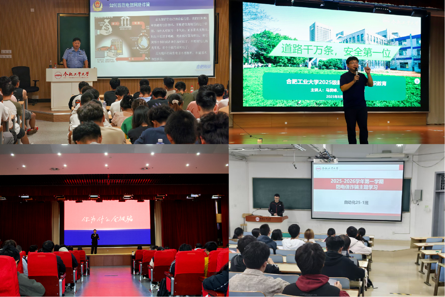 集中赋能,全员覆盖教育。9月初,学院开展安全专题系列主题教育,为新生筑牢入学安全防线。日常工作中,辅导员依托主题班会,实现每月对全体员工的常态化宣传覆盖。9月-11月期间,学院分别在屯溪路、翡翠湖校区特邀合肥市公安局刑侦支队警官,举办2场专题专家讲座,警官们从反诈思路、实操举措、受骗心理等维度,结合真实案例进行系统授课。本学期集中教育实现全体员工多轮次覆盖,秋季学期电信网络诈骗案发率较以往明显降低。