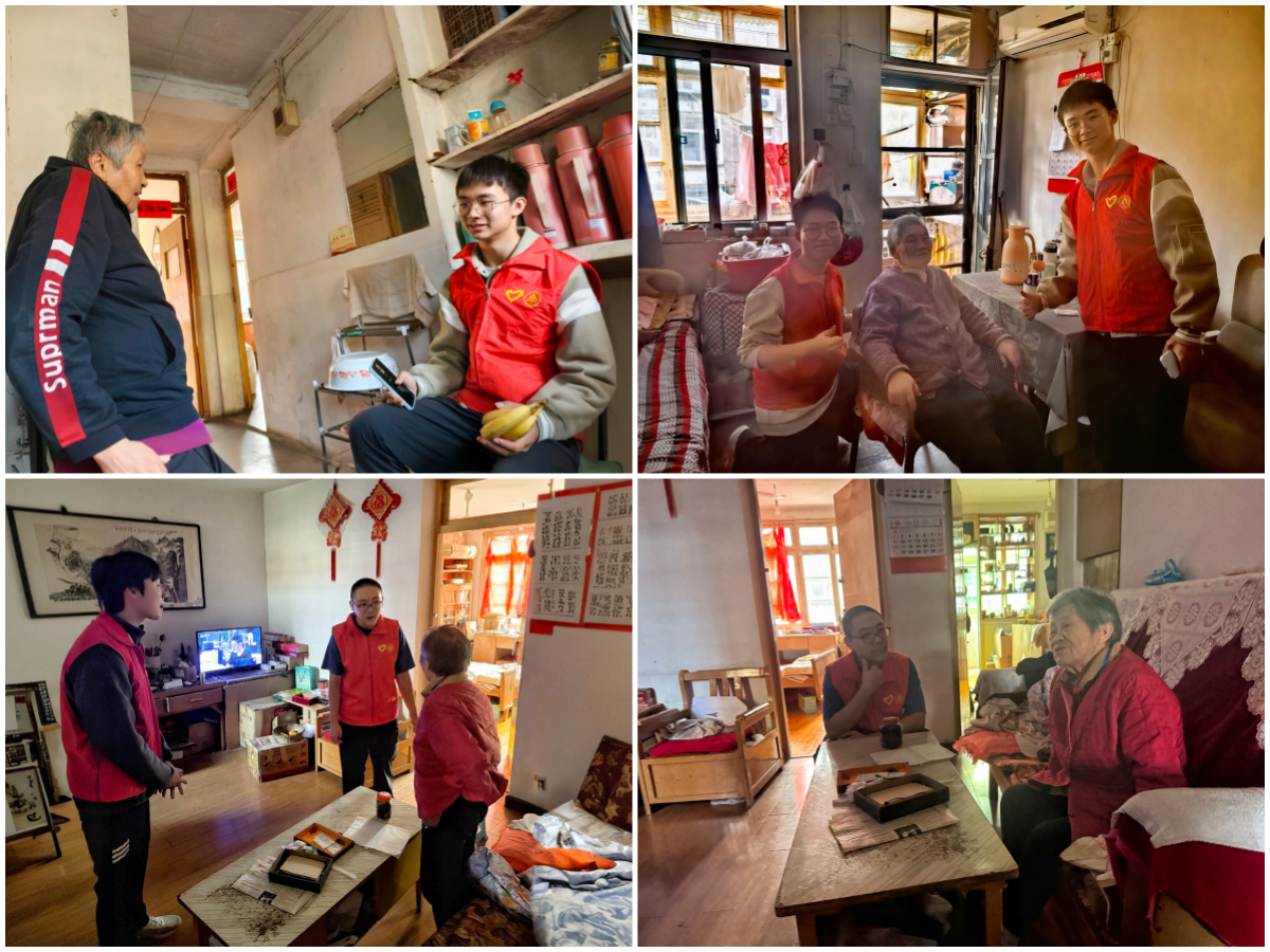 在曙光社区,志愿者分赴各站点,为老人测血压、清杂物、协助养老认证,同步完成社区租房信息统计;随后,排查电动车违规停放等隐患,入户探望独居老人、整理床铺,协助核查住户资料;此外,还携带日用品走访老人,叮嘱保暖安全,助力社区公共事务,清理环境、规整车辆,全方位筑牢服务屏障。在龚湾社区,志愿者聚焦情感陪伴,探访高龄老人,询问身体与生活状况,倾听人生经历与城市情怀,闲谈家常,分享校园趣事,在温馨氛围中为老人驱散孤独。在琥珀街道社区养老服务中心,志愿者们手把手教老人使用智能手机、讲解冬季养生知识并演示按摩手法,入户为独居老人做家务、促膝长谈,为行动不便老人代购代办,以实际帮助与心灵慰藉,让敬老美德落地生根。