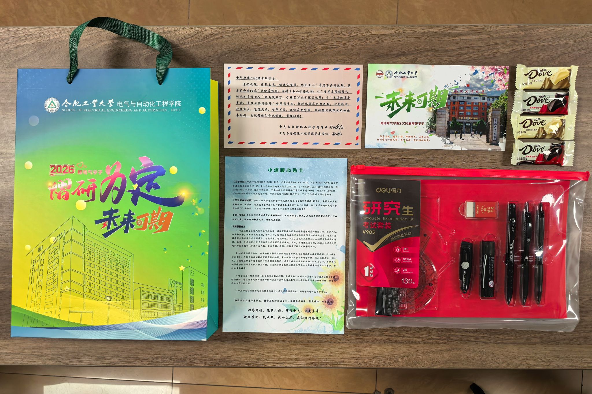 公司为二百余名考研学子精心准备了包含定制手提袋、笔试文具套装、明信片、巧克力、温馨贴士卡的暖心礼包。公司党委书记冯航、经理向念文撰写祝福寄语,通过真挚文字表达对莘莘学子的关心鼓励。员工党员、班级骨干、就业助理等朋辈团队,高效协同完成物资整理与分装工作。公司党委副书记兼纪委书记张栋前往员工宿舍发放礼包,并就报考意向、近期状态等话题同考研学子亲切交流,相关同学表示将以最佳状态自信迎考,不辜负学校与学院的培养与关怀。毕业班辅导员前往主教学楼、图书馆、寝室等场域派发礼包并开展考风考纪教育,提醒全体考研同学以诚信为笔,以实力为墨,共同守护公平公正的考试环境,书写无愧于青春的答卷。
