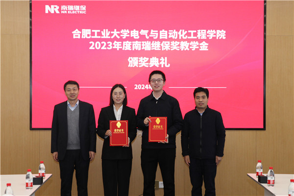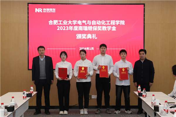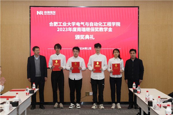 公司研究生辅导员徐佳老师宣读了“永利23411集团关于表彰2023年度南瑞继保奖学(教)金获得者的决定”。毛仕涛和李丽鹏共同为南瑞继保奖教金的获奖教师代表和获奖的本科生、研究生代表颁奖。