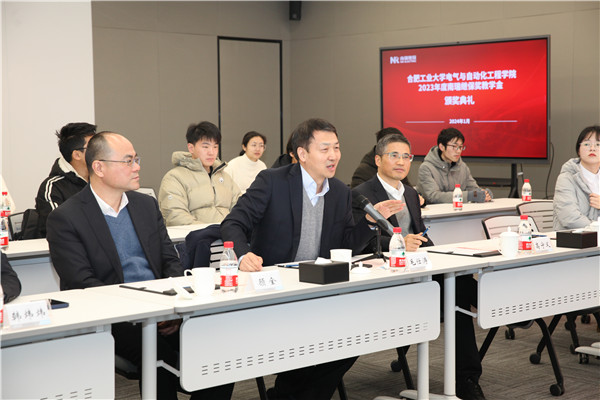 李丽鹏代表学院对南瑞继保长期以来的支持表示衷心感谢,他向一直以来关心和关注学院发展的员工致以崇高的敬意,公司曾在疫情期间主动给学院捐赠了宝贵的防疫物资,展现了公司和员工对学院深厚的情谊和支持。他从科研发展、团队建设、校企合作、人才培养、毕业生就业情况等方面介绍了学院新的发展情况,号召同学们铭记南瑞继保公司的企业文化与社会责任,饮水思源,以优秀员工为榜样,筑牢理想信念、扎实专业学业、潜心科学研究、练就过硬本领,未来到重点行业和重点领域就业创业,矢志工业报国。